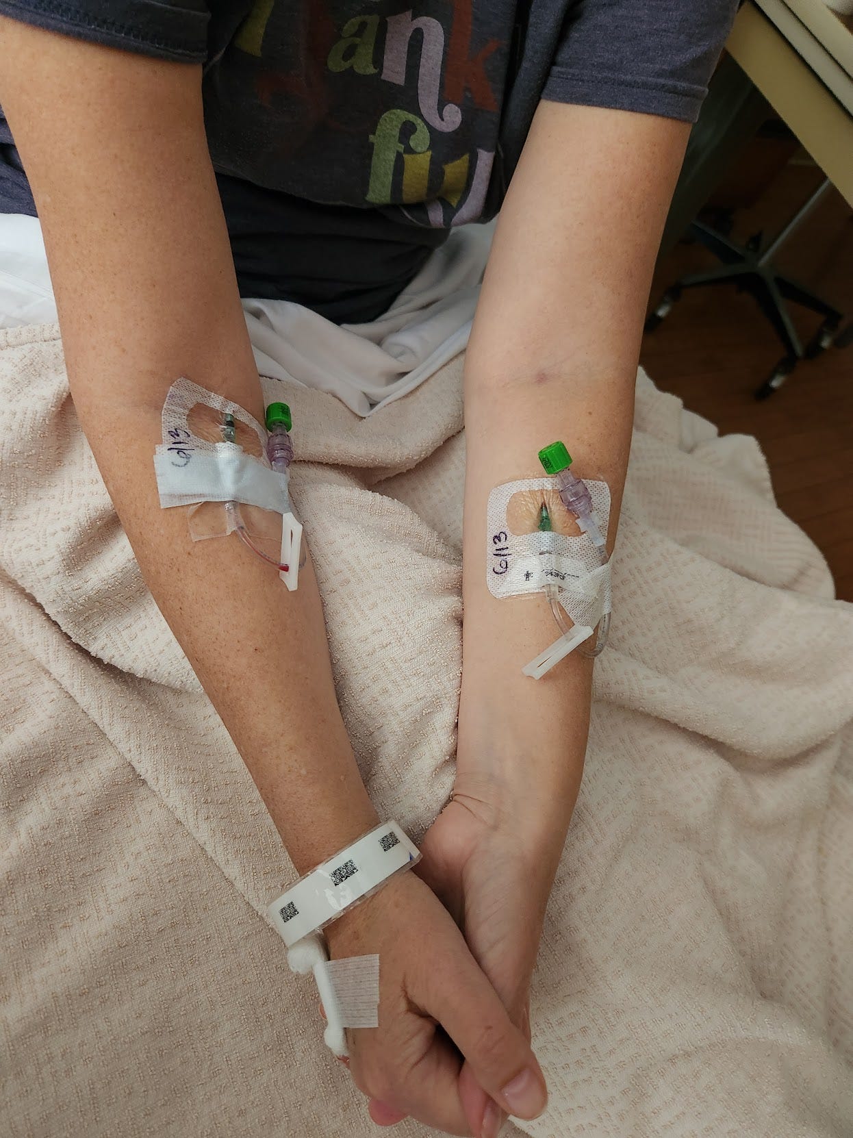 Side Quest: On day 3 of me in the hospital our daughter, who had started her summer job that week working for the Animal Humane Society, came to the hospital a little early. She had gotten bit by a cat toward the end of the day and they sent her home with info to get it checked out on worker’s comp. So while I was resting she and John went downstairs to the ER where they put her on an antibiotic and sent her back up to see me. 3 The next day I triumphantly came home from the hospital where I was set on the couch. Almost immediately Riss asks John to look at the bite. John doesn’t say much about it but turns around and mouths a 4 letter word to me. Riss was on her way to see friends and we did not stop her but John did tell her it looked concerning and she might need to go back in. By the time she got home it was clear she did need to go in. John put me to bed and brought her back to the ER where she was admitted for 2 nights of IV antibiotics. I am not sure John slept for 3 days going between taking care of me and sitting in the hospital with her. I would have told him to stay with her but I could barely stand up by myself, anything outside of walking to the bathroom and back required help. I could not take care of myself. So he exhausted himself caring for both of us. She came home on Monday night, and was back at work Tuesday morning. A lot of drama but an easy recovery.
